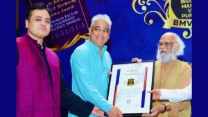 New Delhi (India), August 15: Abhisar Sharma, Rajdeep Sardesai and Jatin Das the recipients of IIPM’s 2023 Bharatiya Manavata Vikas...