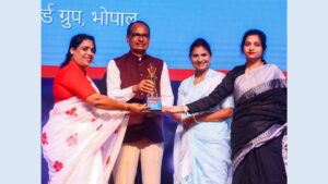 Chief Minister Shivraj Singh Chouhan honours Anuradha Sagar, Sarika Sagar, and Monika Sagar from Mushroom World Group. New Delhi (India),...